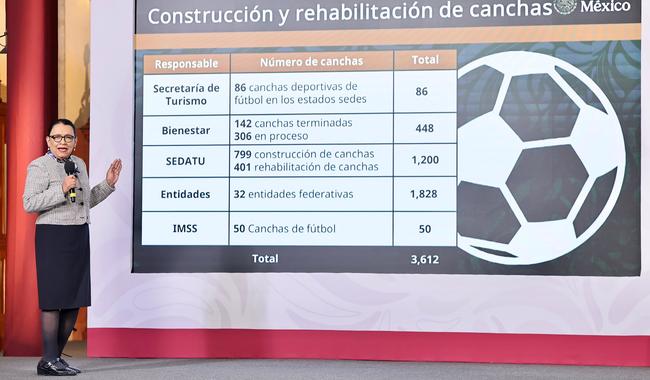 De las 3 mil 612 canchas que están siendo construidas y rehabilitadas: 86 son por parte de la Secretaría de Turismo; 448 de Bienestar; mil 200 de Sedatu; 50 por el IMSS y mil 828 de los estados