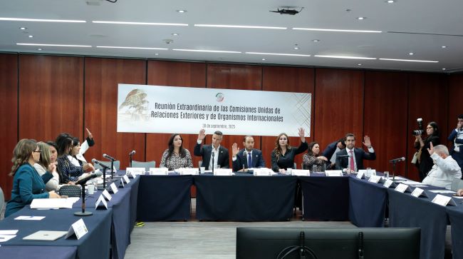 Las comisiones unidas de Relaciones Exteriores y de Organismos Internacionales aprobaron dos dictámenes que ratifican los nombramientos expedidos por la titular del Ejecutivo Federal, Claudia Sheinbaum Pardo, en favor de Alejandro Encinas Rodríguez, Laura Elena Carrillo Cubillas, ante la Organización de los Estados Americanos (OEA), y Agencias de la Organización de las Naciones Unidas, respectivamente.