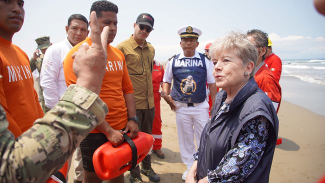 Durante las labores de inspección en el puerto de Coatzacoalcos, la secretaria Bárcena afirmó que se mantiene una supervisión permanente en territorio priorizando en todo momento el bienestar de las comunidades, la protección de los ecosistemas costeros y la vida silvestre.