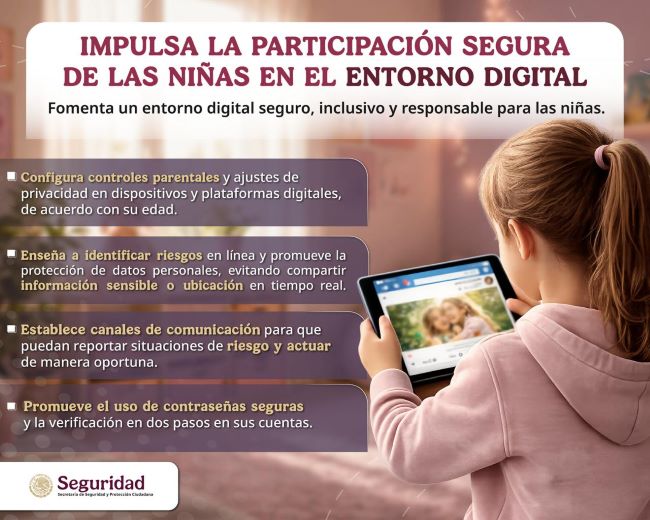 En el marco del Día Internacional de las Niñas en las Tecnologías de la Información y la Comunicación (TIC), la Secretaría de Seguridad y Protección Ciudadana (SSPC), a través de la Unidad de Inteligencia, Investigación Cibernética y Operaciones Tecnológicas, brinda recomendaciones dirigidas a madres, padres de familia y personas tutoras, con el objetivo de acompañar y fortalecer el desarrollo de las niñas dentro de un entorno digital seguro e inclusivo.