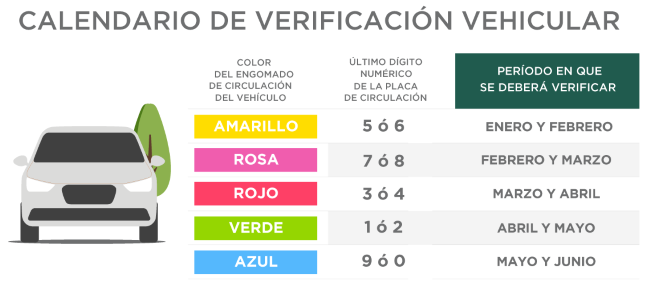 ● Engomado amarillo, terminación de placa 5 o 6: enero y febrero ● Engomado rosa, terminación de placa 7 o 8: febrero y marzo ● Engomado rojo, terminación de placa 3 o 4: marzo y abril ● Engomado verde, terminación de placa 1 o 2: abril y mayo ● Engomado azul, terminación de placa 9 o 0: mayo y junio