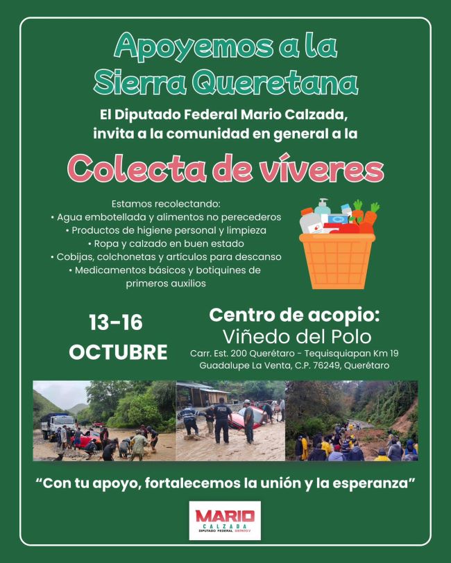 Finalmente, el diputado federal Mario Calzada, reiteró que todo lo recolectado será entregado directamente a las comunidades afectadas, reafirmando su compromiso con el bienestar de las familias queretanas y la atención a las zonas más vulnerables del estado” te invitamos a ser parte de esta cadena de ayuda. Con tu apoyo, fortalecemos la unión y la esperanza”.
