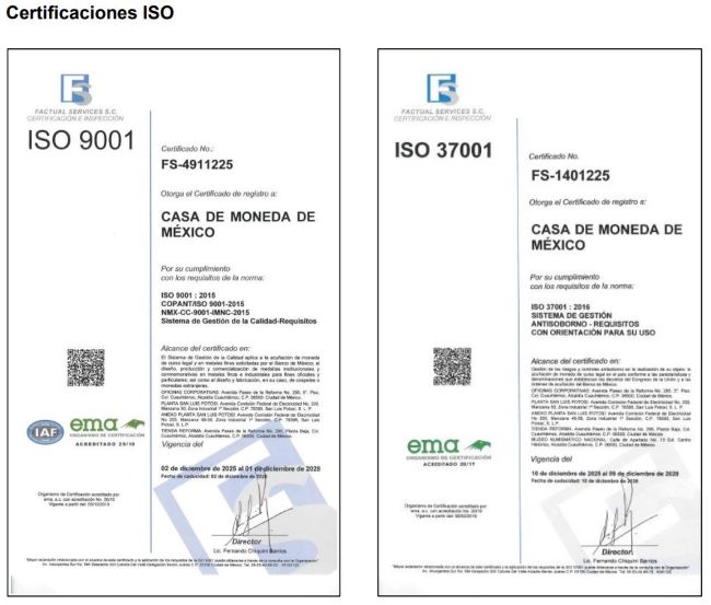 Casa de Moneda de México obtuvo en diciembre de 2025 la certificación de su Sistema de Gestión Integrado, conforme a la norma ISO 9001 para sistemas de gestión de calidad y la norma ISO 37001 para Sistemas de Gestión Antisoborno. Estos sistemas reúnen procesos y responsabilidades que fortalecen la eficacia y la eficiencia operativa de la entidad mediante un marco formal de políticas, procedimientos y prácticas.