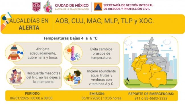 La Secretaría de Gestión Integral de Riesgos y Protección Civil, informa que se activa Alerta Amarilla por pronóstico de temperaturas bajas para la madrugada y mañana del martes 06/01/2026 en las demarcaciones: Álvaro Obregón, Cuajimalpa, Magdalena Contreras, Milpa Alta, Tlalpan y Xochimilco.