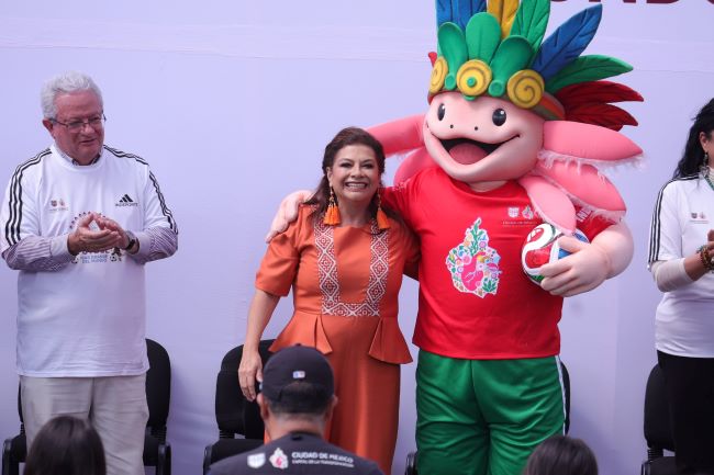 Ante campeones y campeonas mundiales de dominadas, Brugada Molina también presentó a la mascota oficial de la Ciudad de México para el Mundial de Futbol, un ajolote, el cual porta un colorido penacho, con el dorsal número 10 y la leyenda “La ciudad más deportiva”, calcetas blancas y pantaloncillo y tenis verdes, acto que aprovechó para convocar a la ciudadanía a mandar propuestas de nombre.