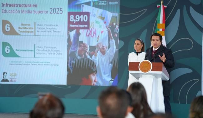 Anunció que para 2026 se construirán 3 nuevos bachilleratos tecnológicos en Chicoloapan, La Paz y Valle de Chalco, además de 5 Ciberbachilleratos en La Paz, Texcoco, Nezahualcóyotl y en Tlalnepantla