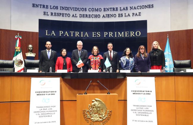 En el marco de la conmemoración de los 80 años de las Naciones Unidas, la Cámara de Senadores, la Organización de las Naciones Unidas en México, en colaboración con la Secretaría de Relaciones Exteriores, agradecen su presencia y les dan la más cordial bienvenida al Conversatorio “México y la ONU: 80 años trabajando por la paz, los derechos humanos y el desarrollo sostenible”.