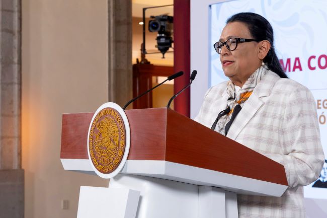 Secretaria de Gobernación, Rosa Icela Rodríguez, durante la Conferencia del Pueblo