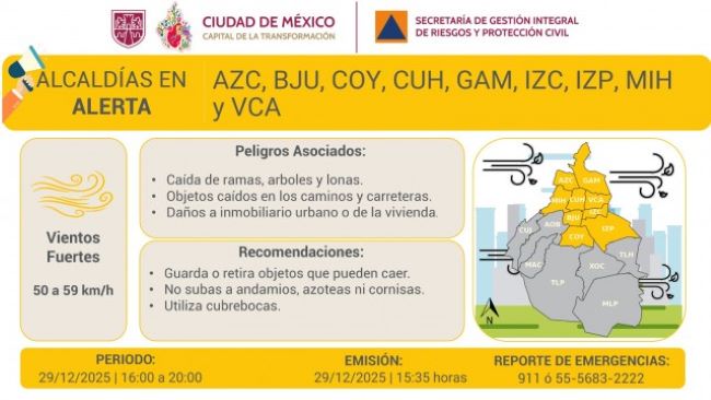 La Secretaría de Gestión Integral de Riesgos y Protección Civil informa que se activa la Alerta Amarilla por vientos fuertes para la tarde y noche del lunes 29/12/2025, en las demarcaciones de Azcapotzalco, Benito Juárez, Coyoacán, Cuauhtémoc, Gustavo A. Madero, Iztacalco, Iztapalapa, Miguel Hidalgo y Venustiano Carranza.