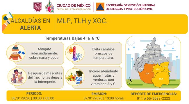 También se informa que se activa ALERTA AMARILLA por pronóstico de temperaturas bajas para el mismo periodo de tiempo, en las demarcaciones Milpa Alta, Tláhuac y Xochimilco.