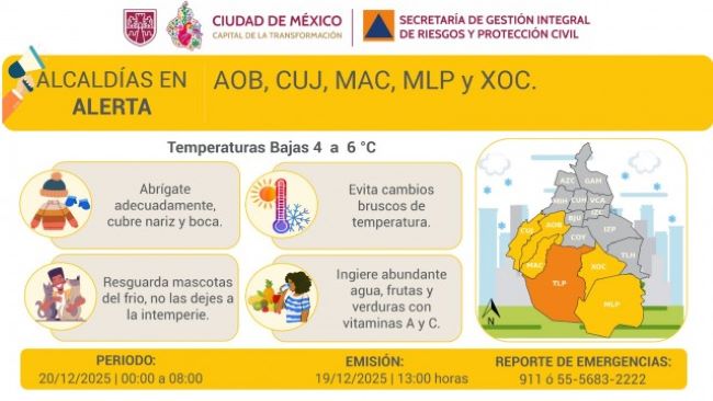 Asimismo, se informa que se activa Alerta Amarilla por pronóstico de temperaturas bajas para la madrugada y mañana del sábado 20/12/2025, en las Alcaldías de Álvaro Obregón, Cuajimalpa, La Magdalena Contreras, Milpa Alta y Xochimilco.