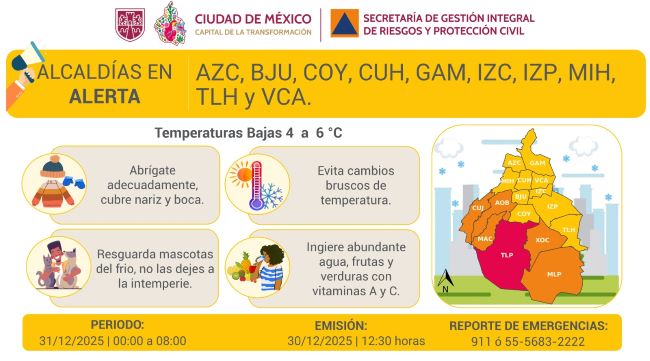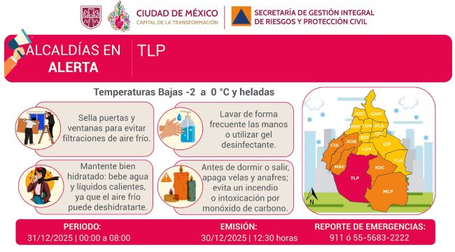 La Secretaría de Gestión Integral de Riesgos y Protección Civil informa que se activa ALERTA ROJA por pronóstico de temperaturas bajas para la madrugada y la mañana del miércoles 31/12/2025, en la demarcación Tlalpan. Se pronostican temperaturas de entre -2 a 0 grados Celsius y heladas, entre las 00:00 horas y las 08:00 horas.